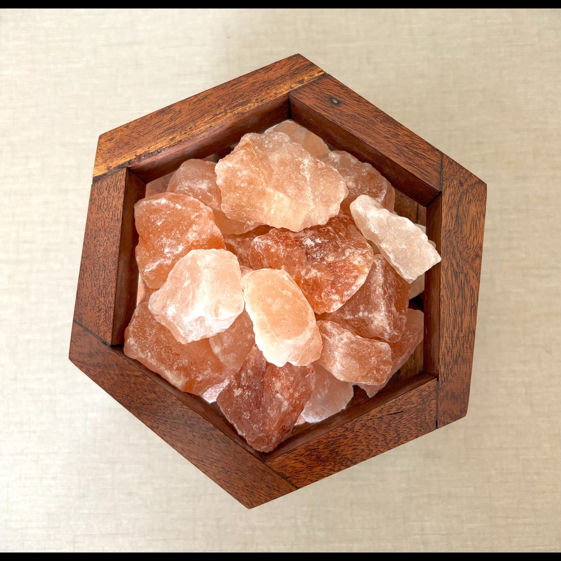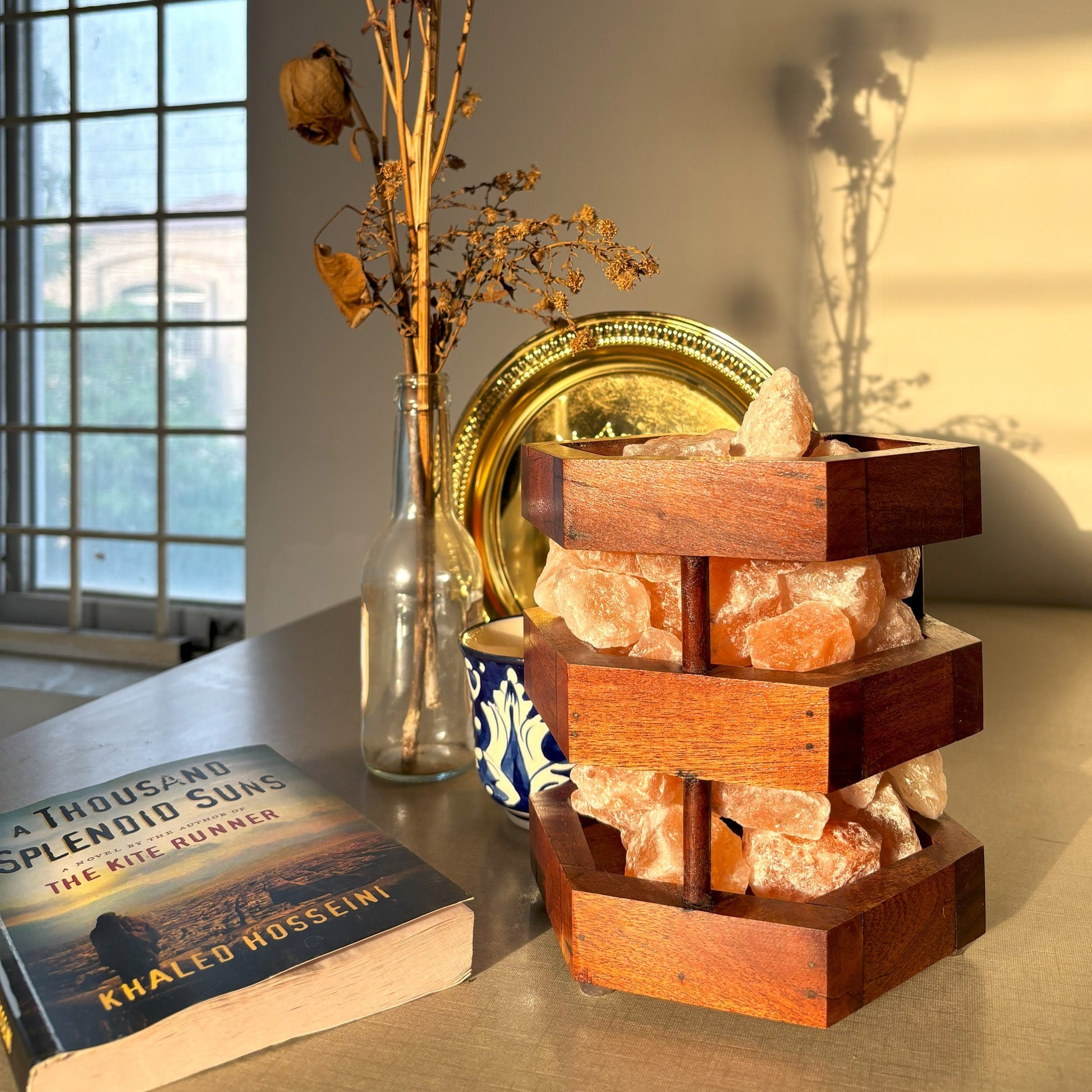 The Hexa Glow brings modern design to natural salt. Its wooden hexagonal frame cradles glowing chunks of Himalayan salt, casting a warm amber light that calms and grounds your space.