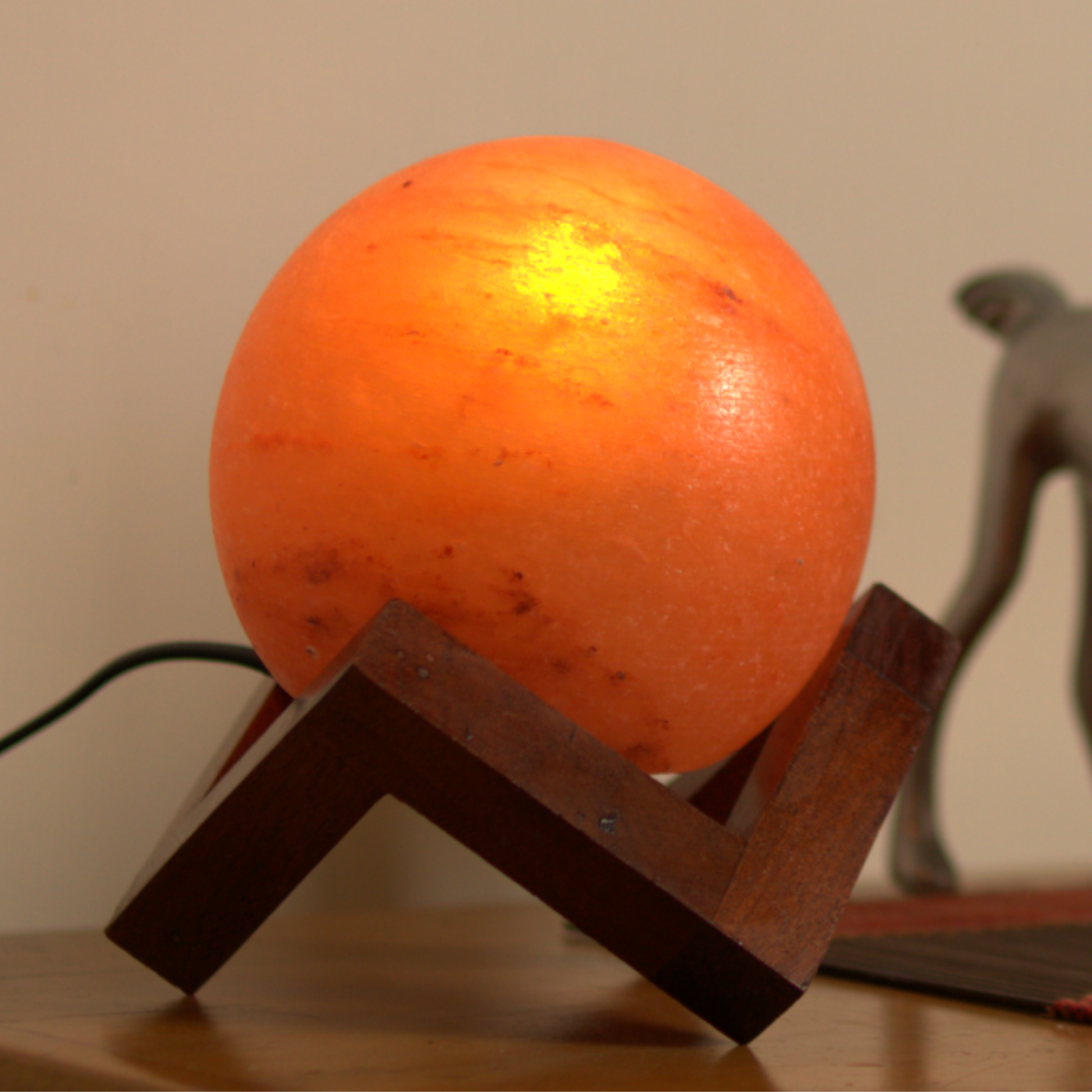 The Moonlit Oasis glows like a quiet moonrise. A hand-carved sphere of Himalayan pink salt resting on a wooden base, it brings balance, calm, and a gentle amber light to any corner of your home.